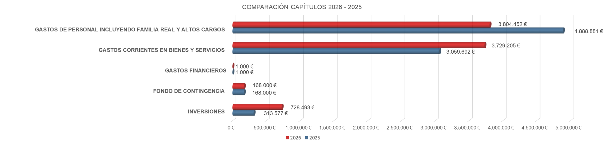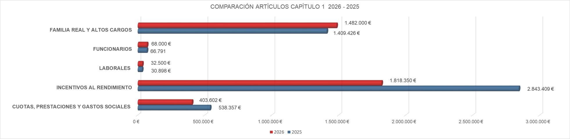 El presupuesto para este ejercicio en este capítulo disminuye en un 22,18 % respecto al presupuesto de 2025. El descenso es consecuencia, por un lado, de cambios en la normativa interna relativa a gratificaciones de personal, así como el traslado al capítulo 2 “Gastos corrientes en bienes y servicios” de diversos gastos que previamente eran presupuestados en capítulo 1 “Gastos de personal” y que se considera más adecuado, de acuerdo con su naturaleza económica, imputarlos a dicho capítulo.