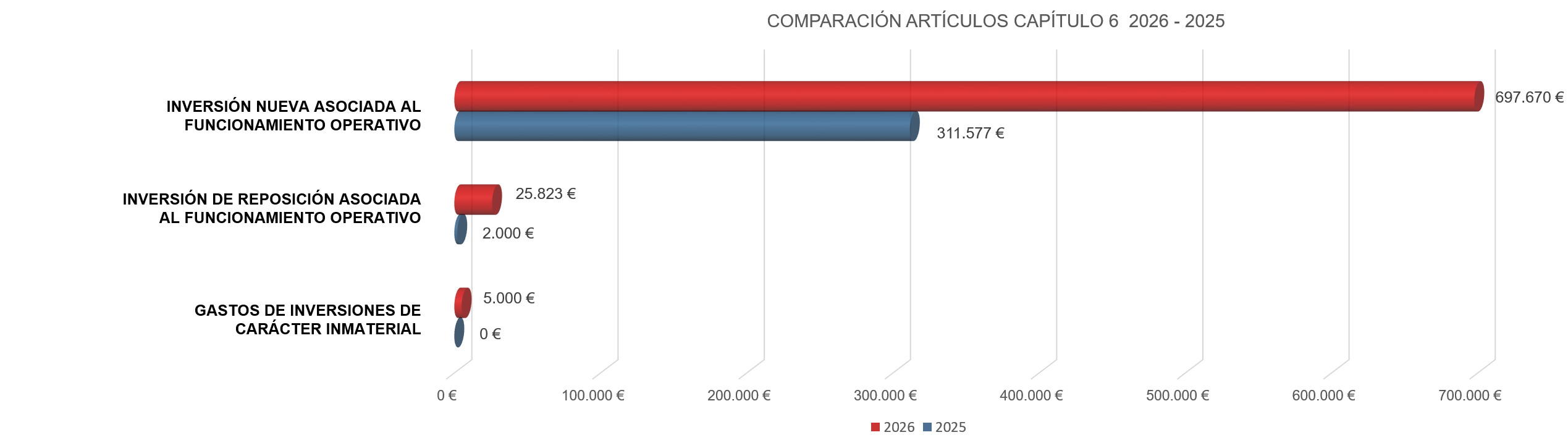 El presupuesto para este ejercicio en inversiones se incrementa un 132,35% respecto al presupuesto del ejercicio 2025, debido a los compromisos previos en inversiones, así como al desarrollo de nuevos proyectos en este capítulo.